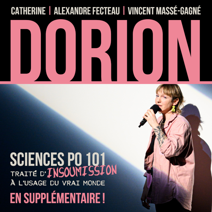 Témoignant du grand succès de sa tournée, des supplémentaires s’ajoutent au calendrier déjà bien rempli de Catherine Dorion avec son spectacle Sciences Po 101, traité d’insoumission à l’usage du vrai monde.  Productions Martin Leclerc/Groupe Juste pour divertir et Nous sommes ici annoncent aujourd’hui de nouvelles dates pour le printemps prochain, soit les 13 et 14 mai 2026 à la Cinquième Salle de la Place des Arts et les 17 et 18 juin 2026 à la salle Octave-Crémazie du Grand Théâtre de Québec. Les billets sont déjà en vente.