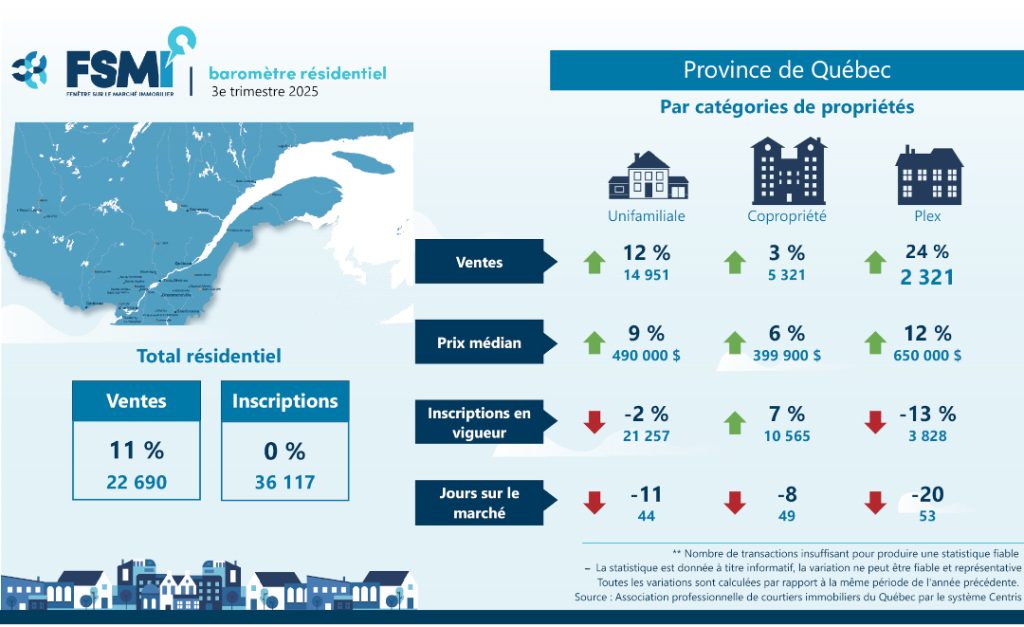 L’Association professionnelle des courtiers immobiliers du Québec (APCIQ) vient de publier les plus récentes statistiques du marché immobilier résidentiel de la province de Québec pour le 3e trimestre de 2025, établies d’après la base de données provinciale Centris des courtiers immobiliers.